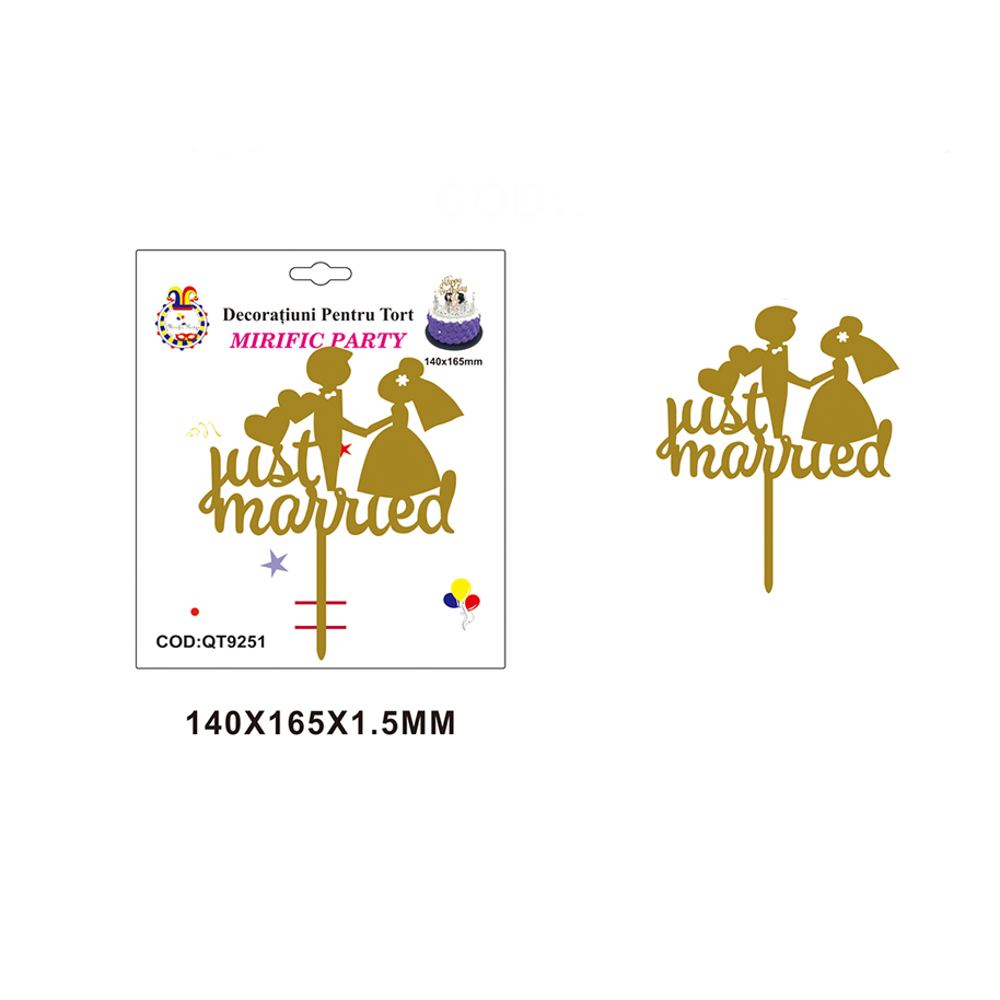 Decoratiune pentru tort ' Just married ' 16.5 x 14 cm QT9251auriu