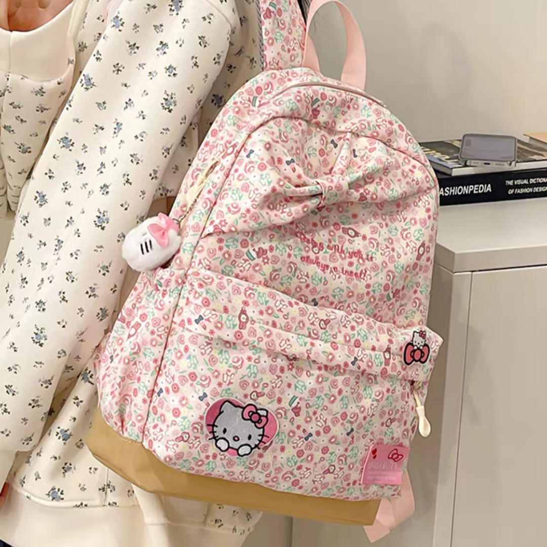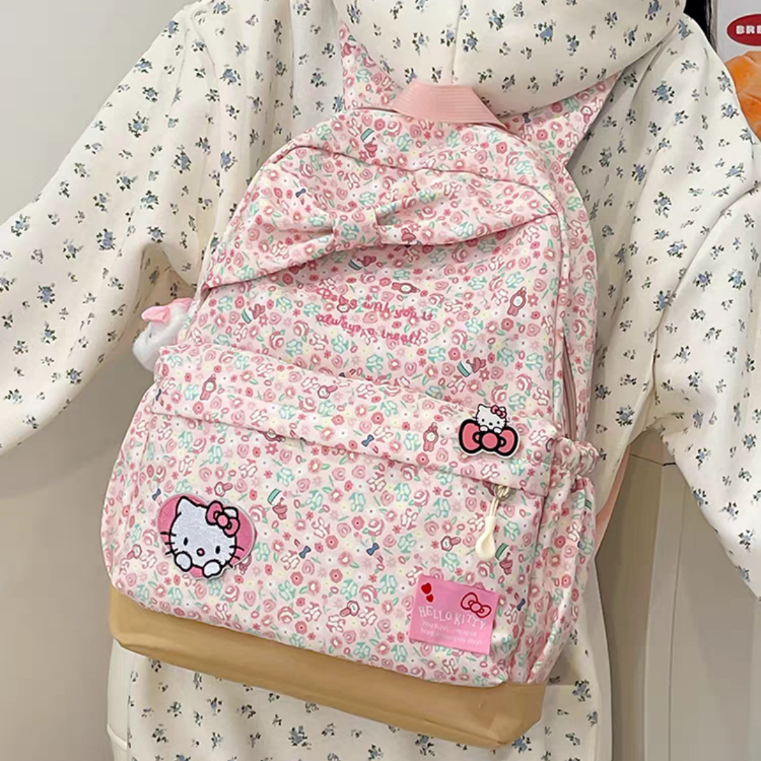 Acest rucsac spatios cu ' Hello Kitty ' este perfect pentru a fi luat la scoala, serviciu, sau in calatorii, este practic si are un aspect foarte placut din punct de vedere estetic. Confectionat dintr-un material durabil si calitativ. Compartimentul principal este prevazut cu un fermoar rezistent si ofera suficient spatiu pentru a transporta carti, caiete, rechizite, obiecte scolare, ipad, s.a. In partea din fata gasim un compartiment aditional prevazut cu fermoar. Buzunarele laterale sunt ideale pentru transportul sticlelor de apa sau a obiectelor mici.