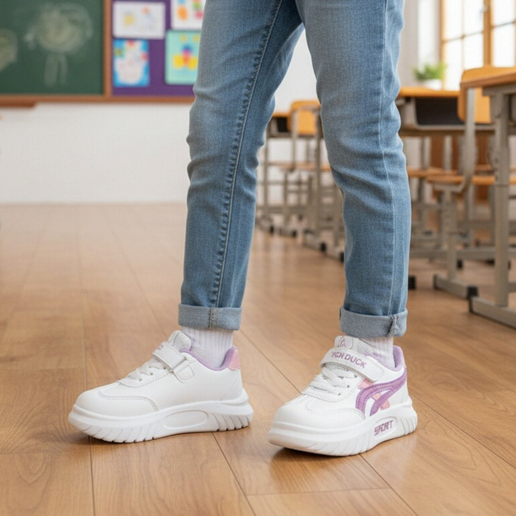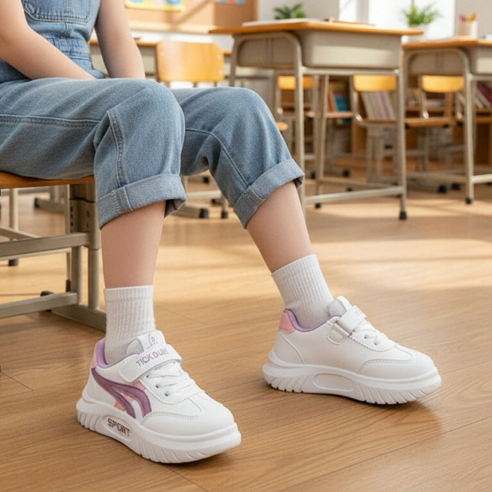 Acești pantofi sport sunt alegerea ideală pentru copiii care vor să îmbine confortul cu un design modern. Sunt realizați din material super respirabil, moale și confortabil, absoarbe rapid transpirația. Oferă libertate de mișcare, stabilitate și confort în timpul mișcărilor. Interiorul oferă confort de utilizare. Talpa este ușoară, are o bună aderență, dând astfel un plus de comoditate în timpul mersului. Pentru o potrivire perfectă și o incălțare facilă, pantofii au sistem de închidere șiret + velcro(scai).    ​​​