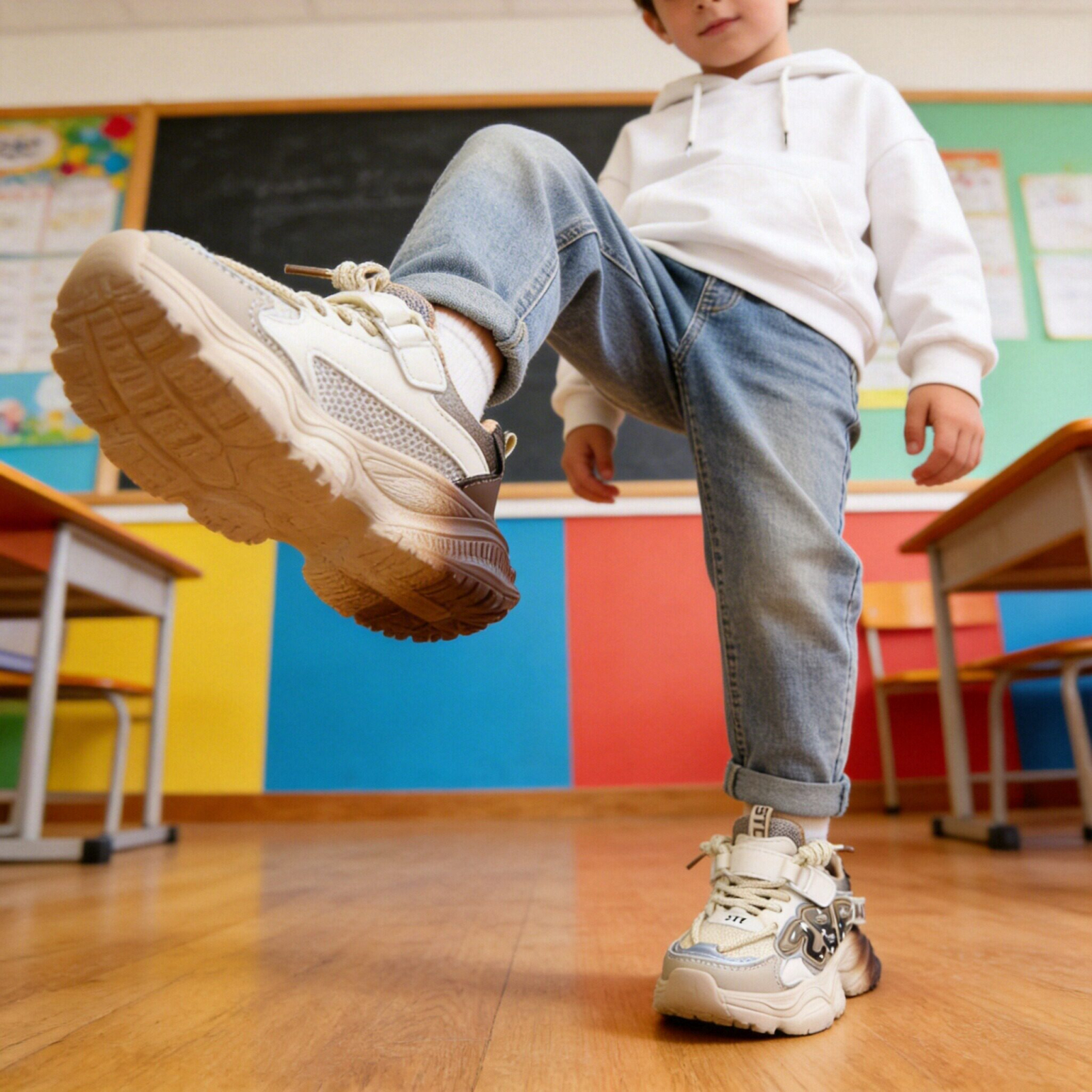 Acești pantofi sport sunt alegerea ideală pentru copiii care vor să îmbine confortul cu un design modern. Sunt realizați din material super respirabil, moale și confortabil, absoarbe rapid transpirația. Oferă libertate de mișcare, stabilitate și confort în timpul mișcărilor. Interiorul oferă confort de utilizare. Talpa este ușoară, are o bună aderență, dând astfel un plus de comoditate în timpul mersului.