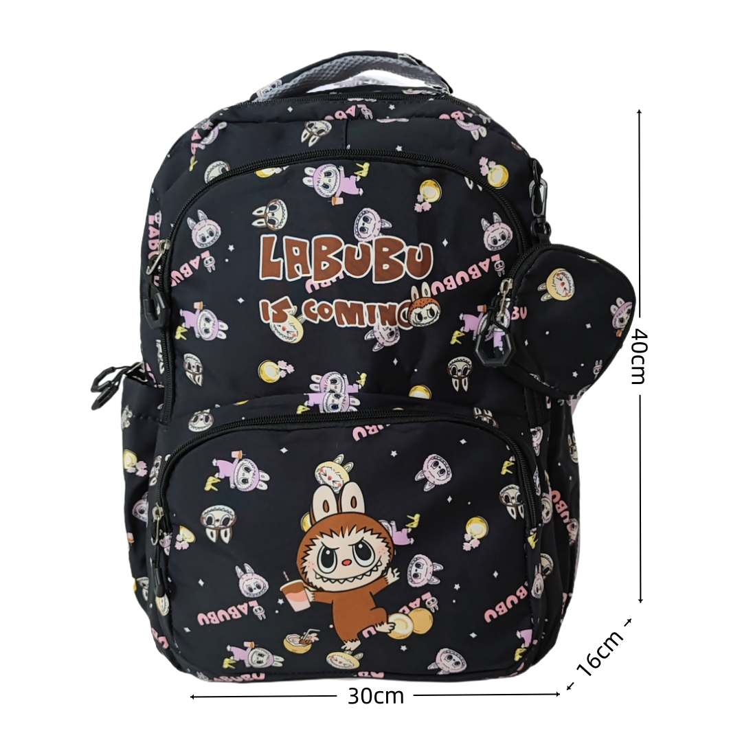 Acest rucsac spatios cu personaje este perfect pentru a fi luat la scoala, naveta zilnica, serviciu, sau in calatorii, este practic si are un aspect foarte placut din punct de vedere estetic. Confectionat dintr-un material durabil si calitativ. Compartimentul principal este prevazut cu un fermoar rezistent si ofera suficient spatiu pentru a transporta carti, caiete, rechizite, obiecte scolare, ipad, s.a. In partea din fata gasim doua compartimente aditionale prevazute cu fermoar si un accesoriu de tip pusculita. Buzunarele laterale sunt ideale pentru transportul sticlelor de apa sau a obiectelor mici.