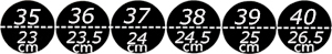 *Nota: Lungimea talpicului din interiorul pantofului poate fi diferită la anumiți producători, astfel tabelul de mărimi prezentat este doar unul orientativ și dimensiunile pot varia. De exemplu, daca piciorul este mai gros la rist sau are monturi, chiar daca lungimea piciorului corespunde unui numar din tabel, marimea nu se mai respecta deoarece piciorul nu va mai intra pana in varf. Daca un model este mai ascutit la varf, de obicei trebuie achizitionat un numar mai mare, mai ales daca piciorul este mai gros in zona degetelor. La calapoadele patrate sau rotunde de obicei se respecta masuratorile clasice.