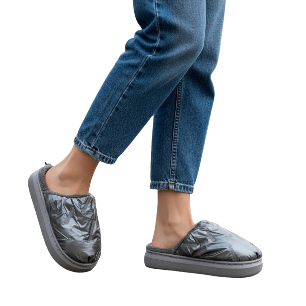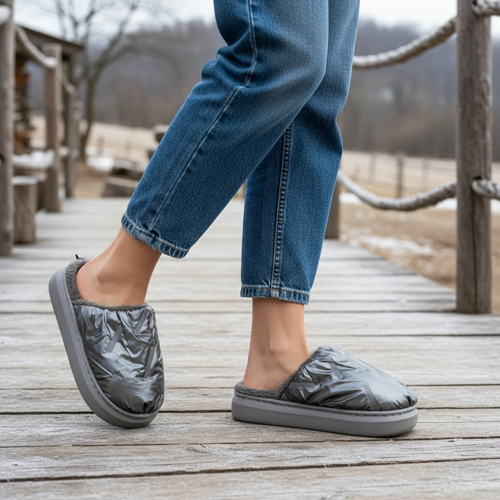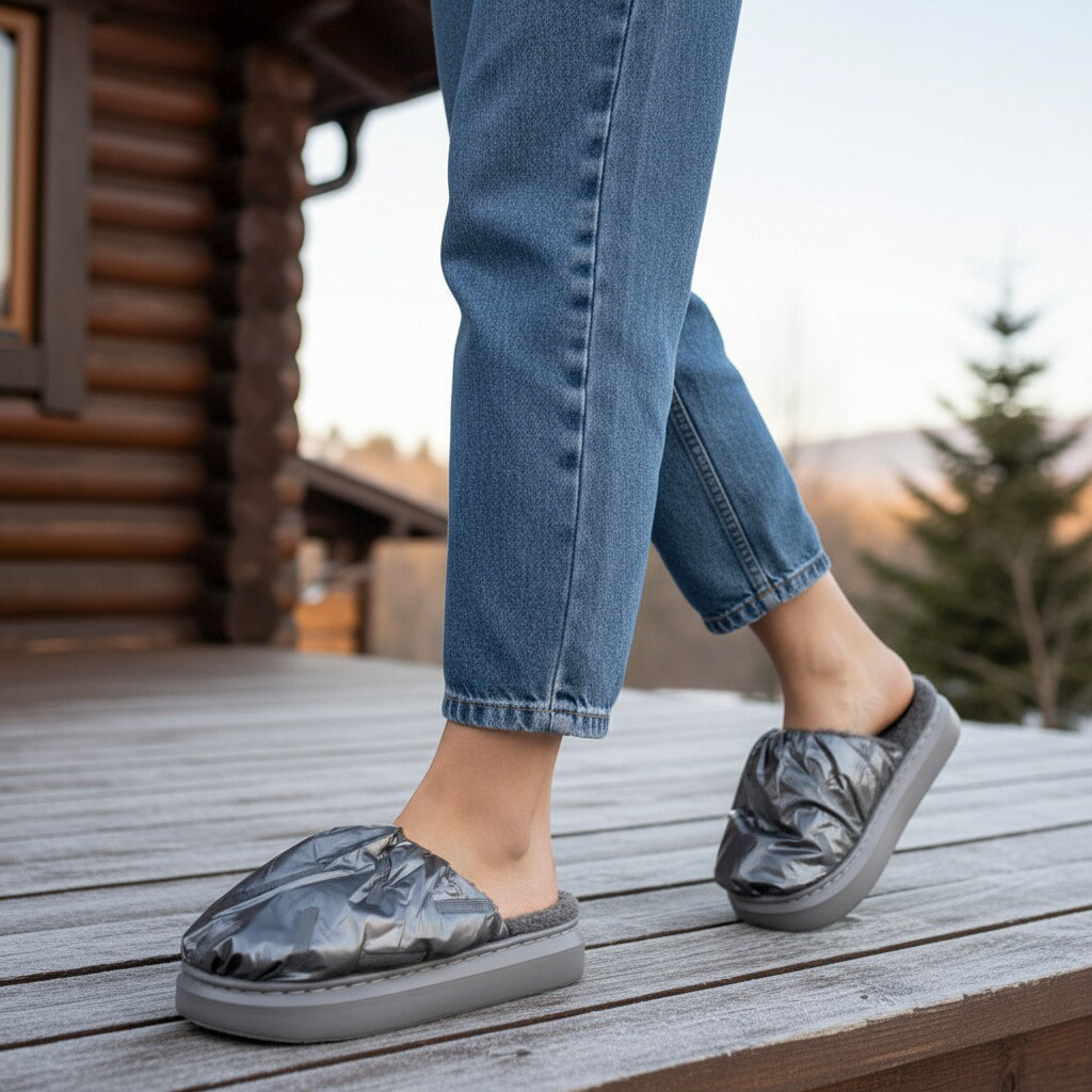 Papuci de casă pufoși și relaxanți, lucrați din materiale moi și călduroase. Sunt alegerea perfectă pentru confort și încălzire.
