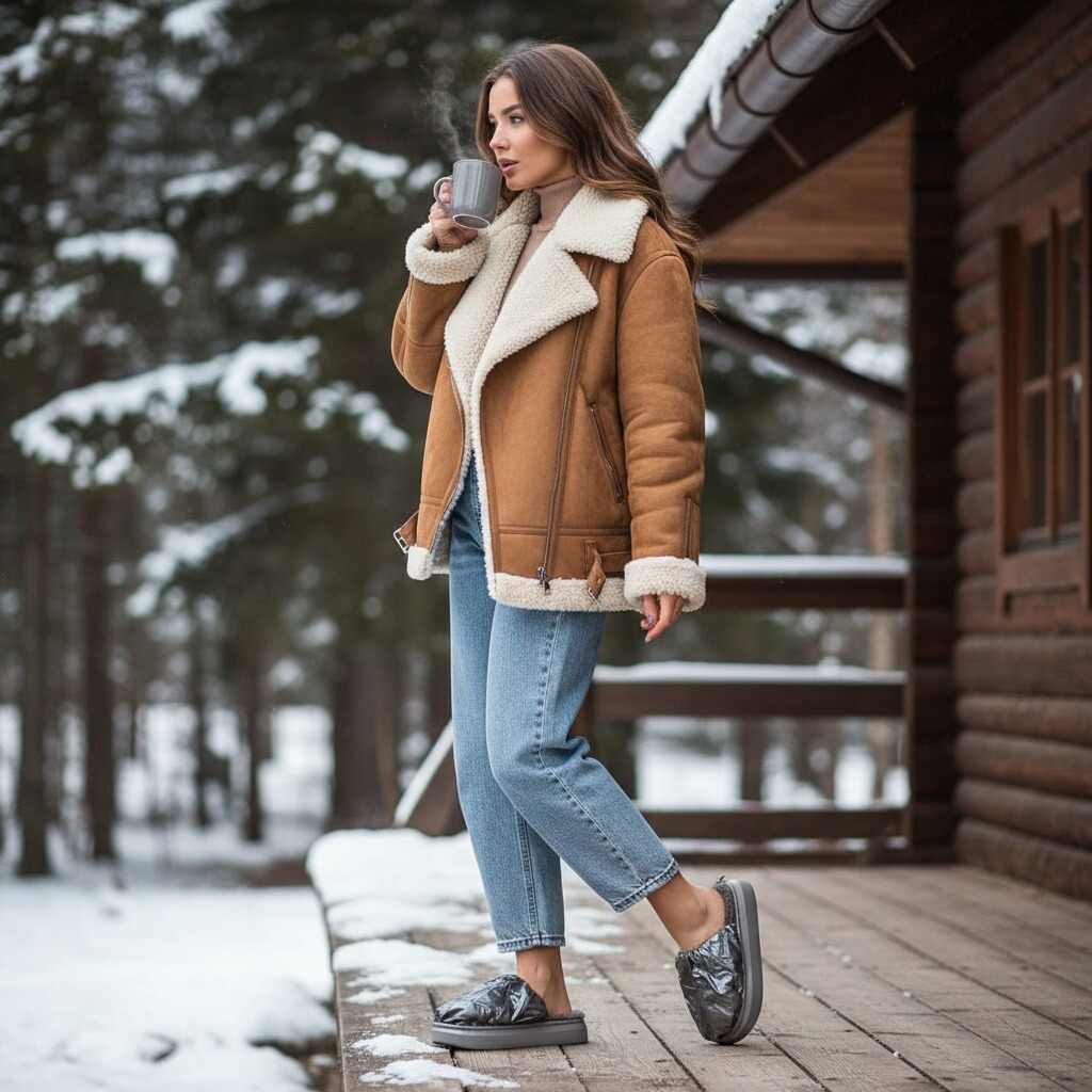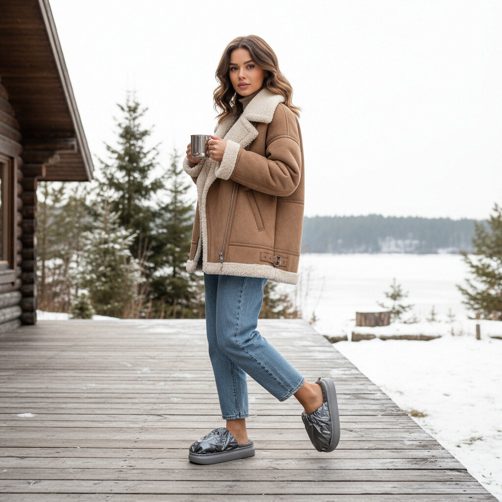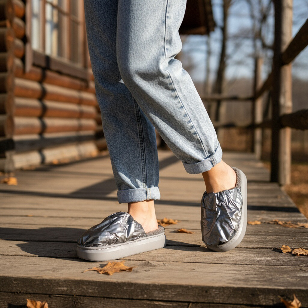 Papuci de casă pufoși și relaxanți, lucrați din materiale moi și călduroase. Sunt alegerea perfectă pentru confort și încălzire.