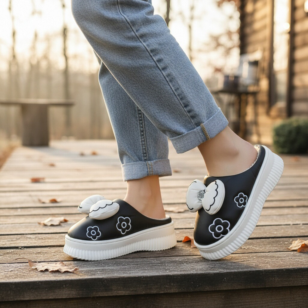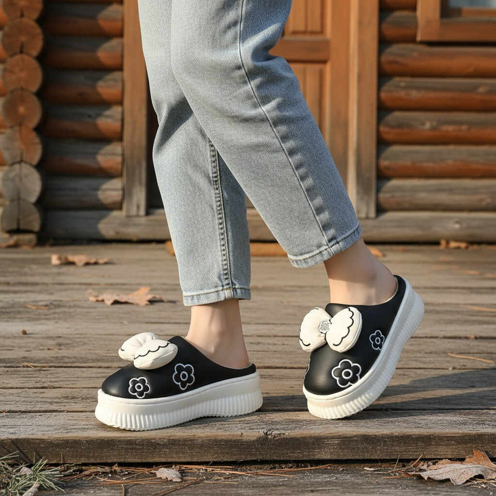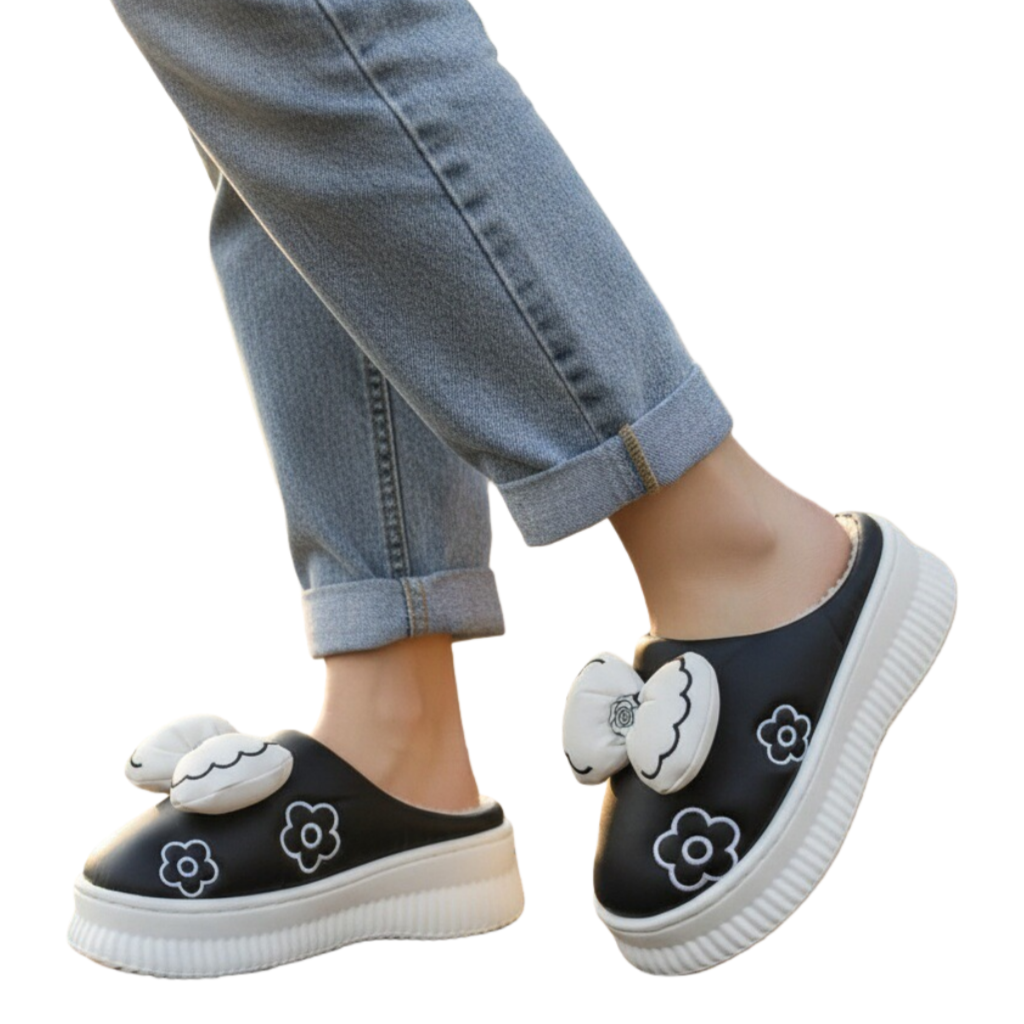 Papuci de casă pufoși și relaxanți, lucrați din materiale moi și călduroase. Sunt alegerea perfectă pentru confort și încălzire. Detalii: • Compoziție: 90% textil, 10% sintetic; • Talpă anti-alunecare, 100% cauciuc; • Înălțime platformă: 4 cm;