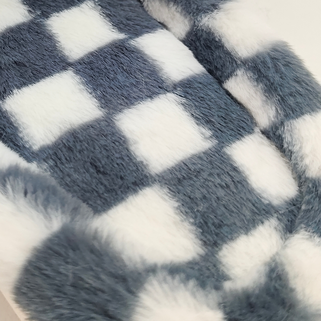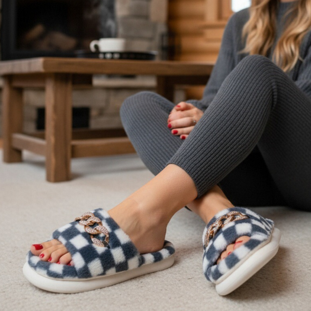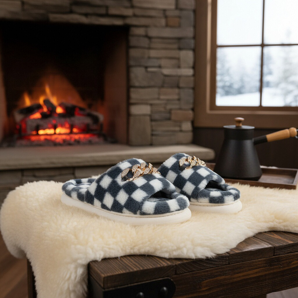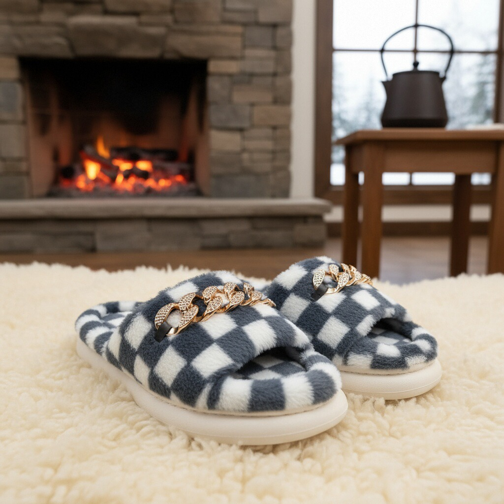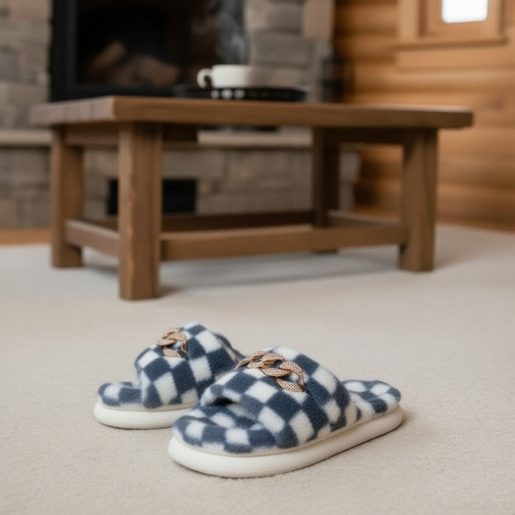 Papuci de casa pufosi, model in carouri H15gri albastrui