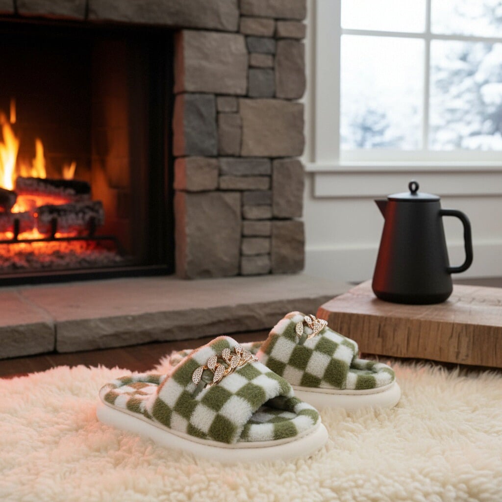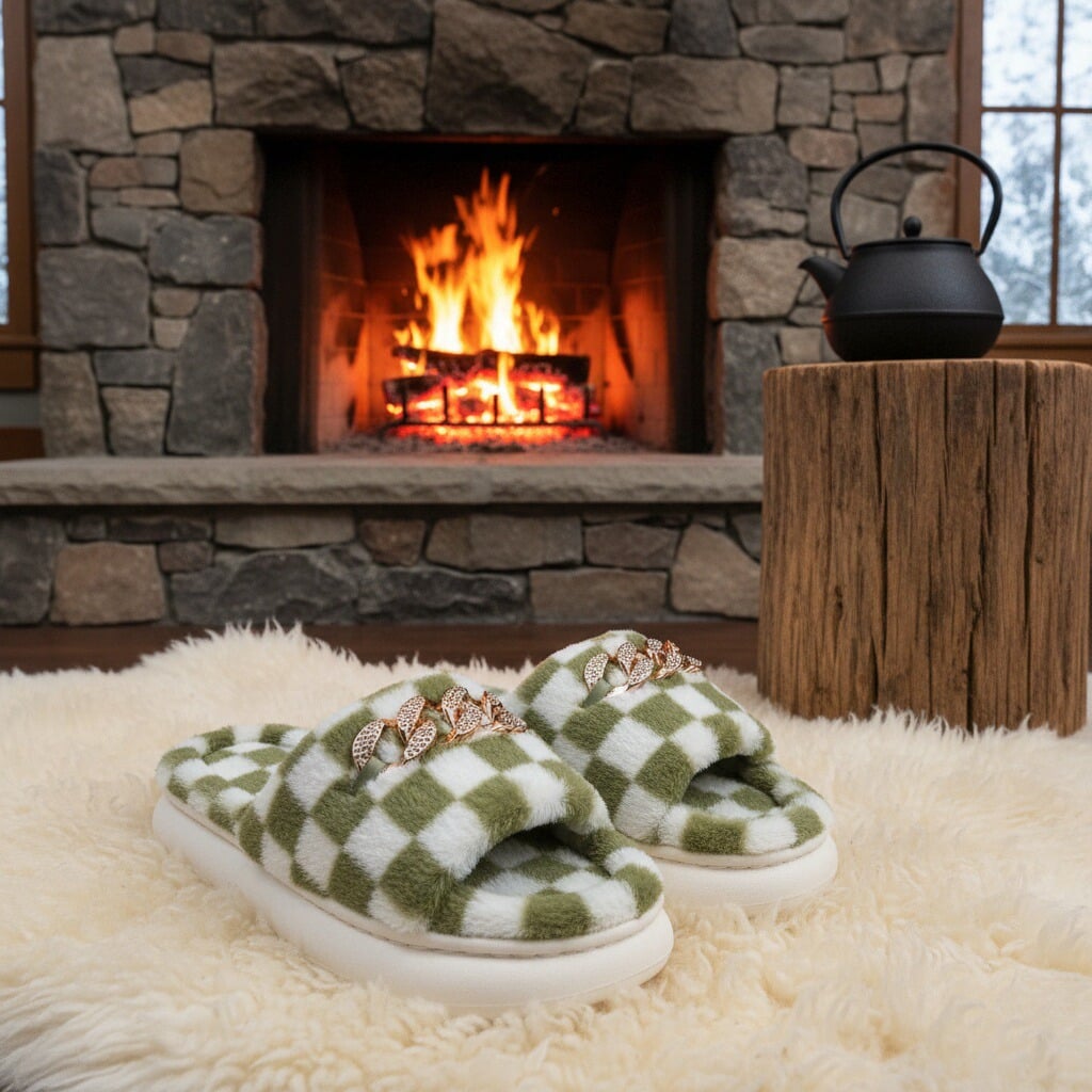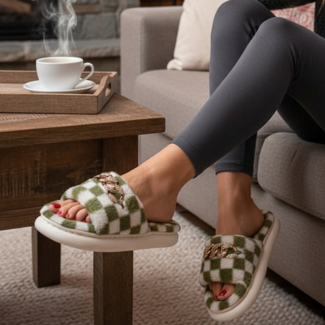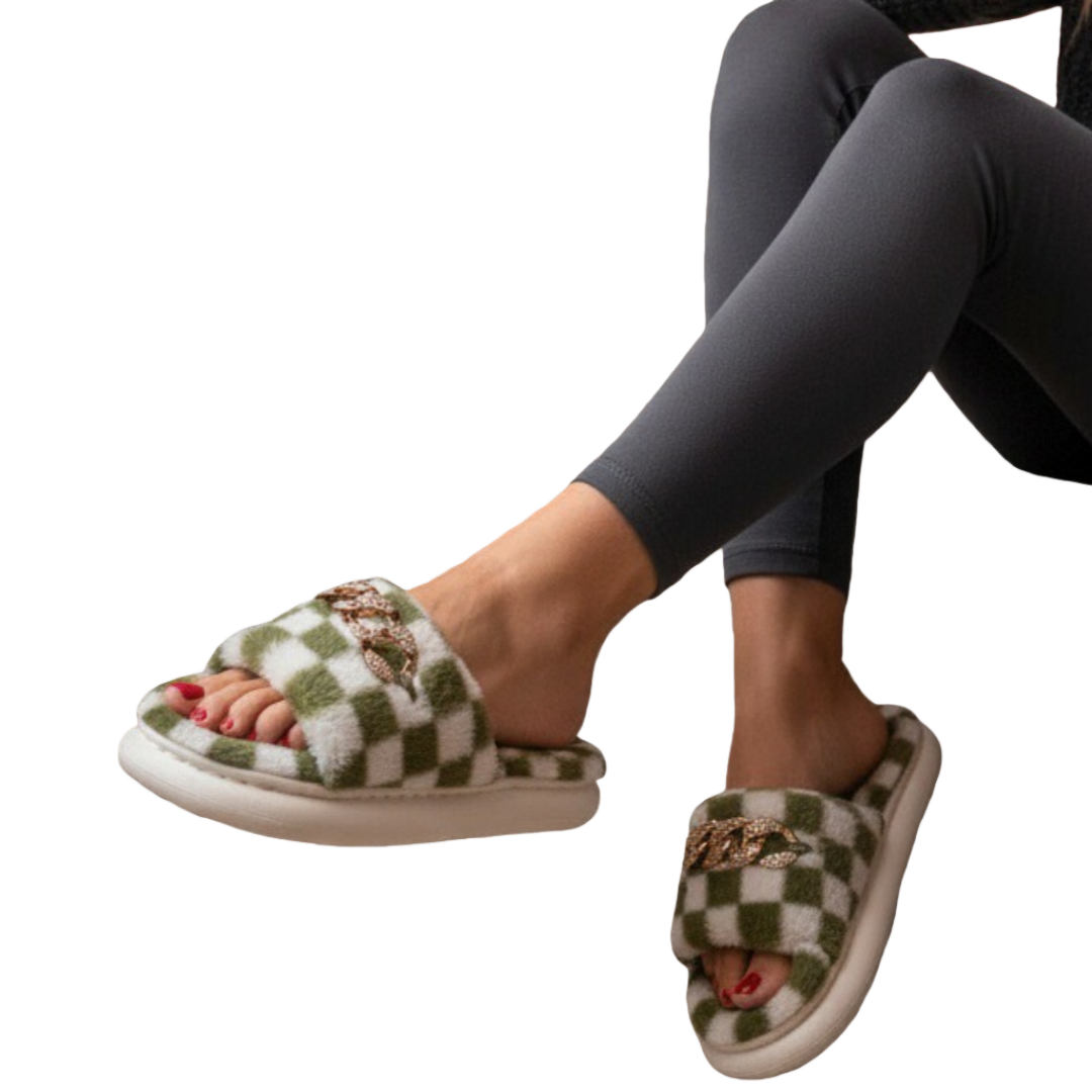Papuci de casă cu vârf deschis, pufoși și relaxanți, lucrați din materiale moi și călduroase. Sunt alegerea perfectă pentru confort și încălzire. Detalii: • Compoziție: 90% textil, 10% sintetic; • Talpă anti-alunecare, 100% cauciuc; • Înălțime talpă: 2 cm;