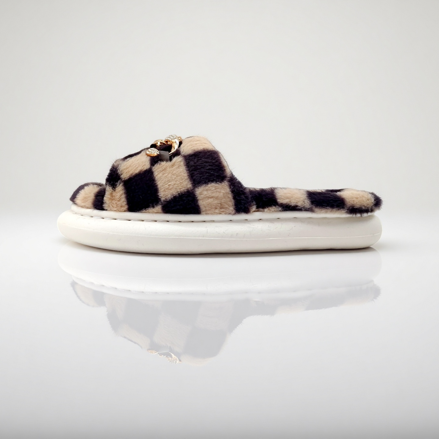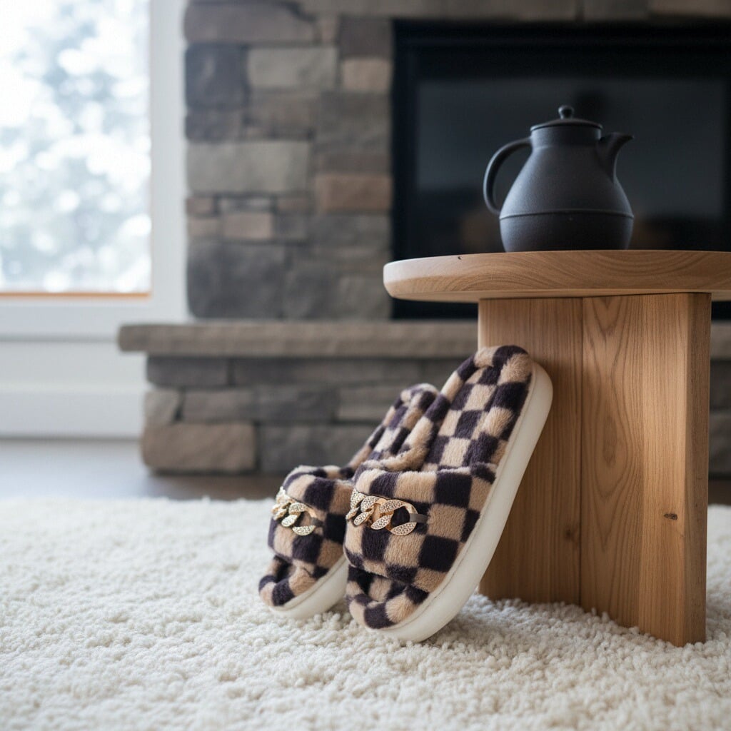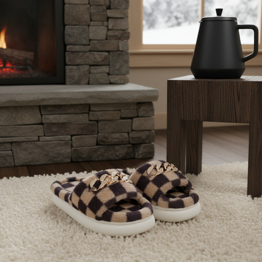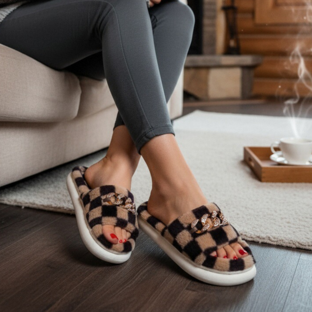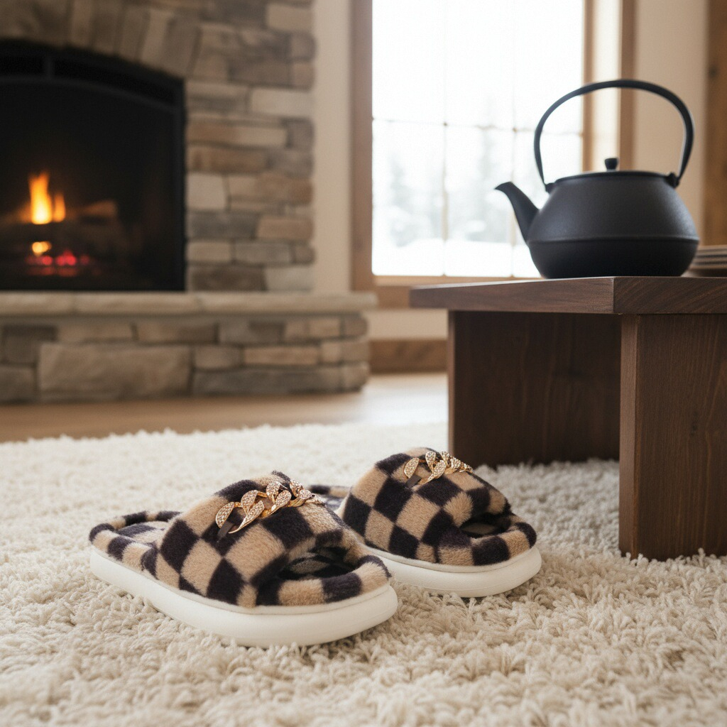 Papuci de casă cu vârf deschis, pufoși și relaxanți, lucrați din materiale moi și călduroase. Sunt alegerea perfectă pentru confort și încălzire.