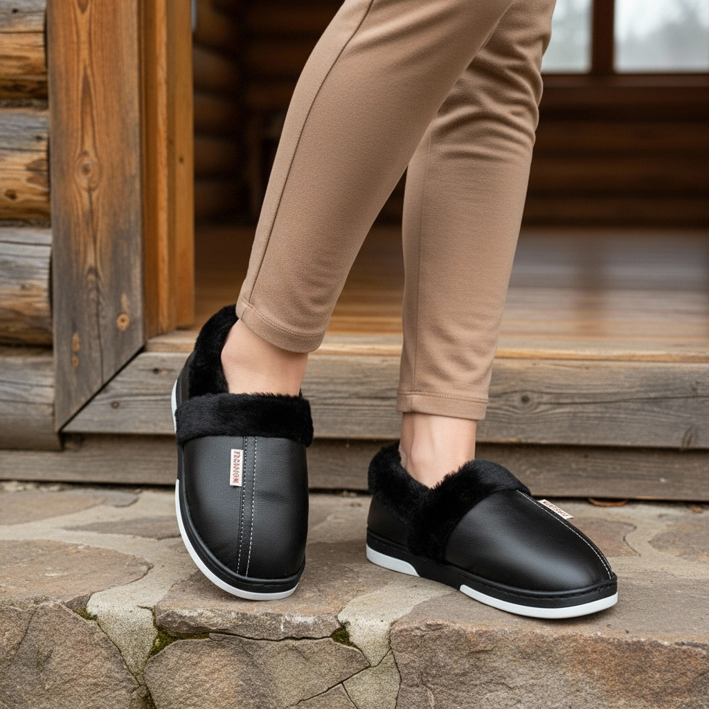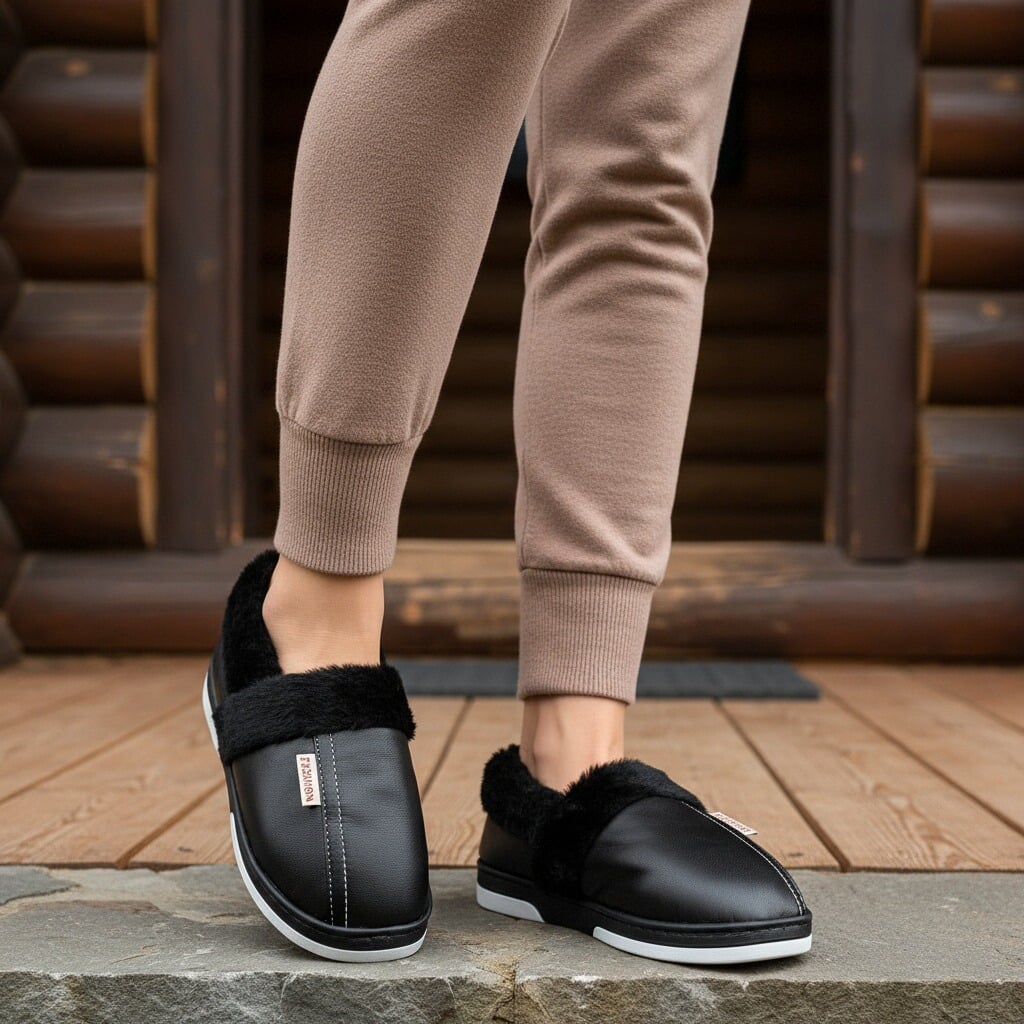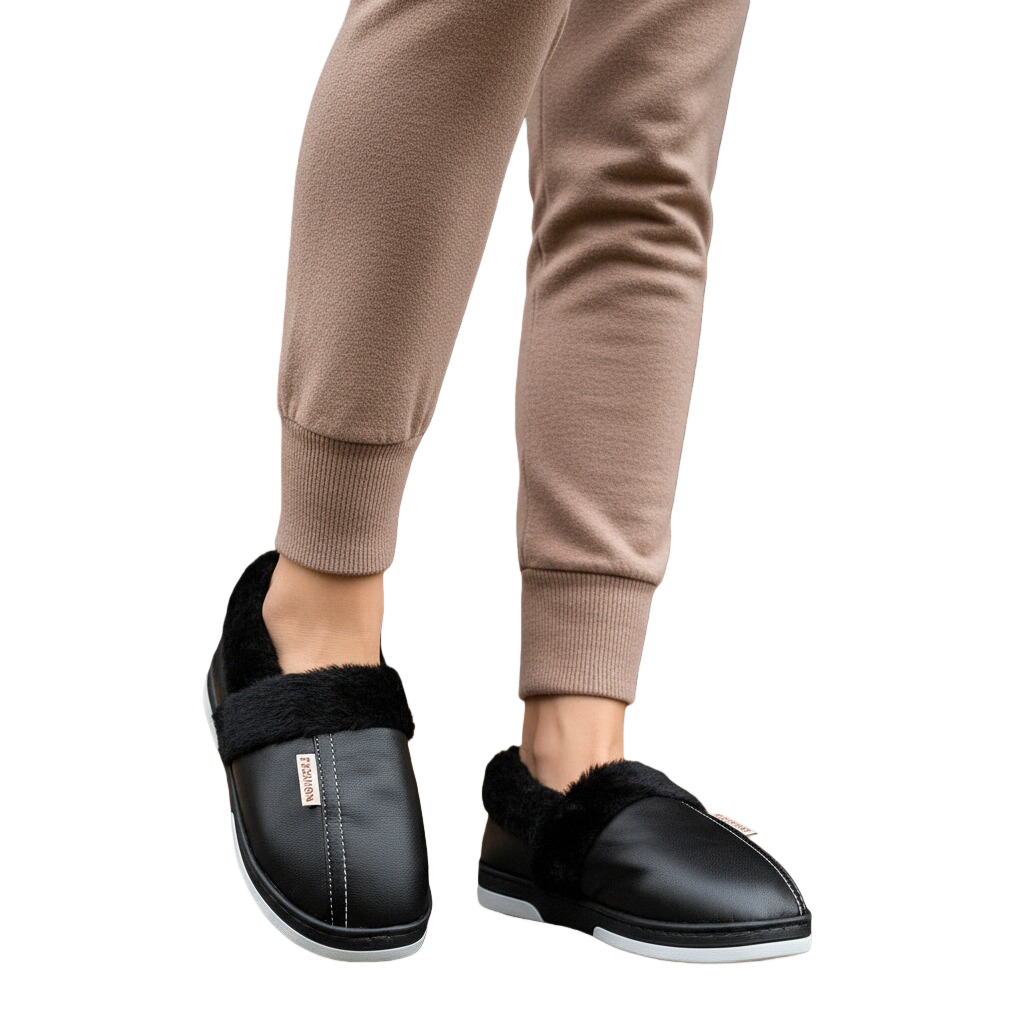 Papuci de casă pufoși și relaxanți, lucrați din materiale moi și călduroase. Sunt alegerea perfectă pentru confort și încălzire.