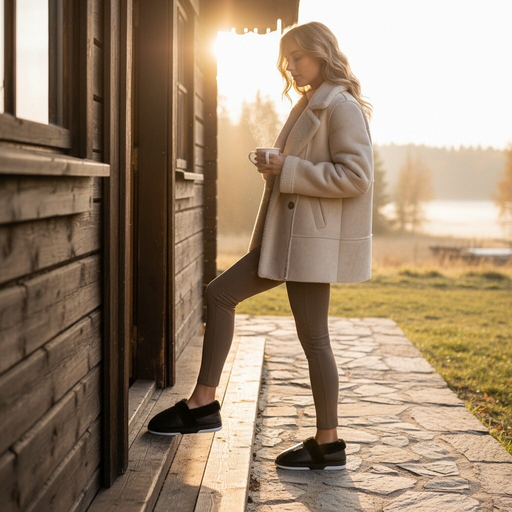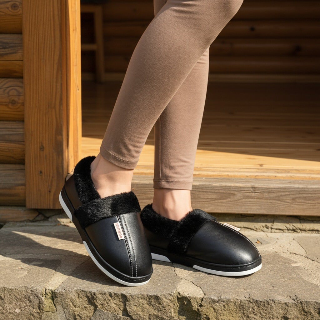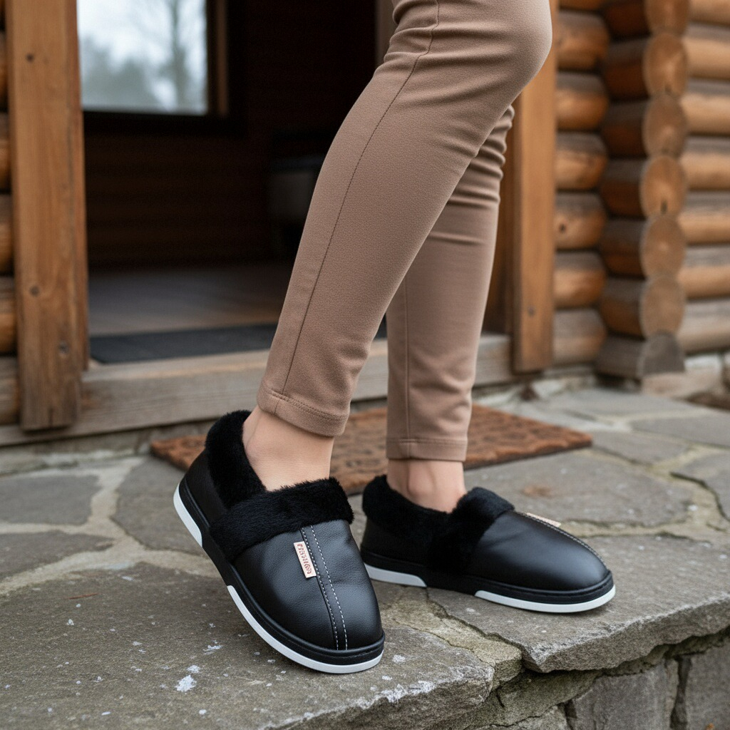 Papuci de casă pufoși și relaxanți, lucrați din materiale moi și călduroase. Sunt alegerea perfectă pentru confort și încălzire.