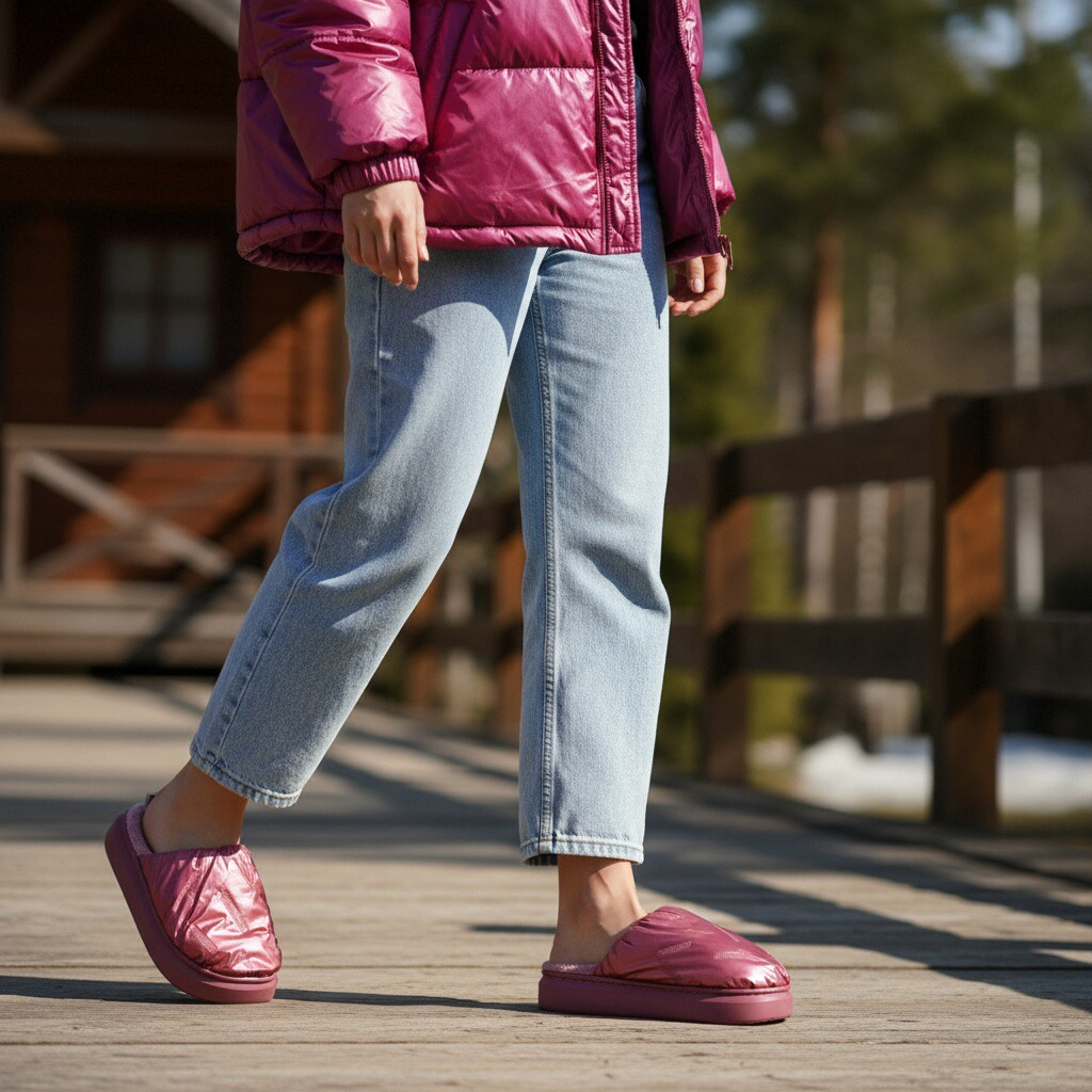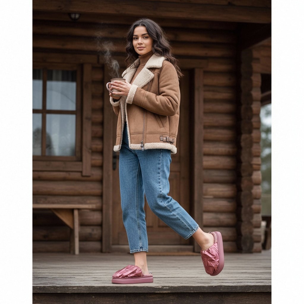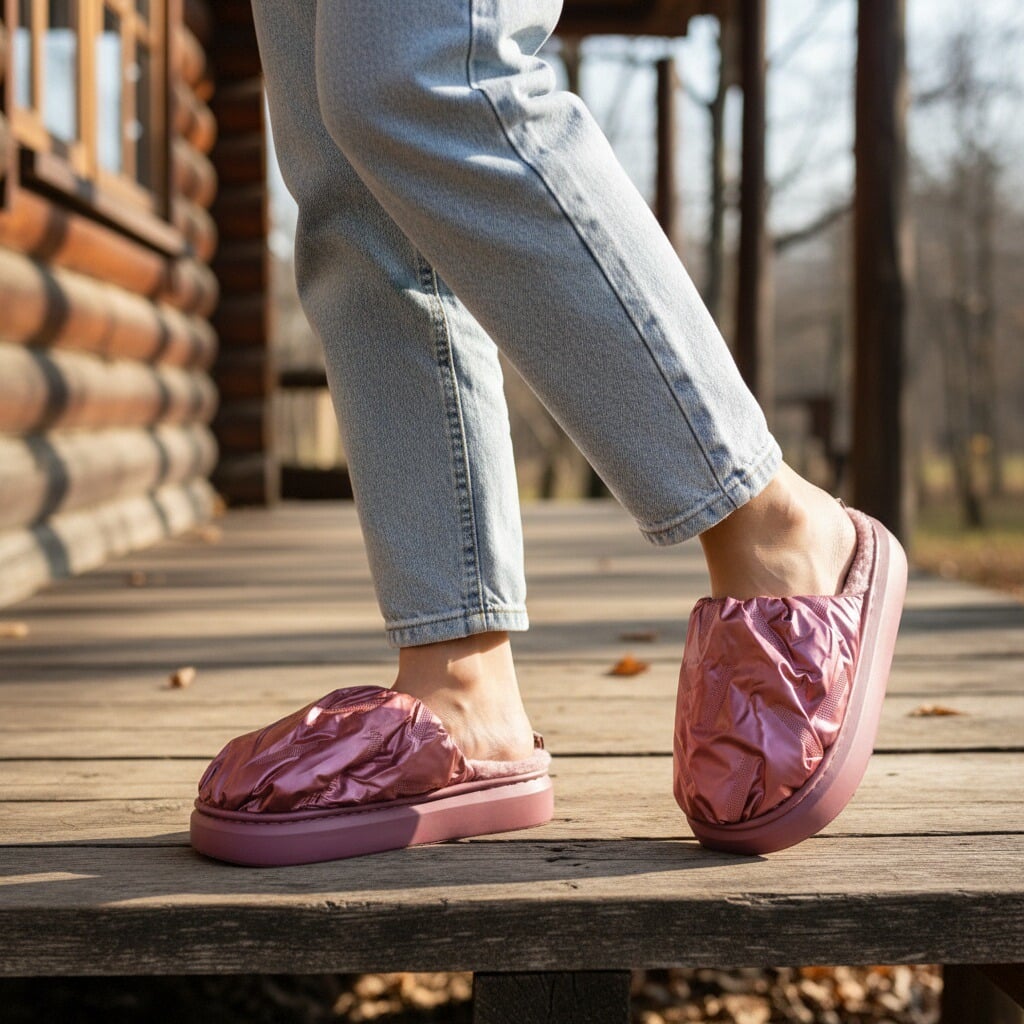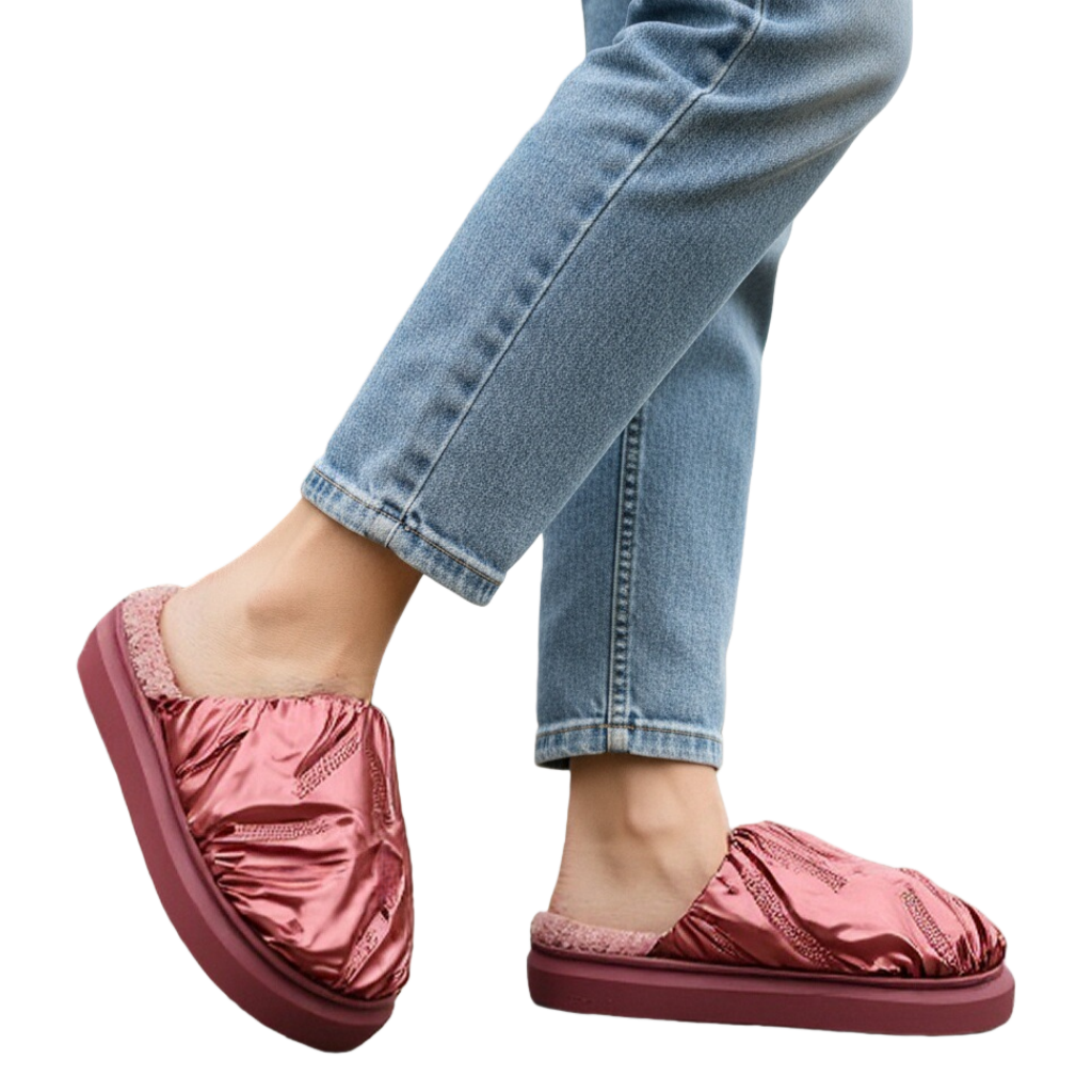 Papuci de casă pufoși și relaxanți, lucrați din materiale moi și călduroase. Sunt alegerea perfectă pentru confort și încălzire.