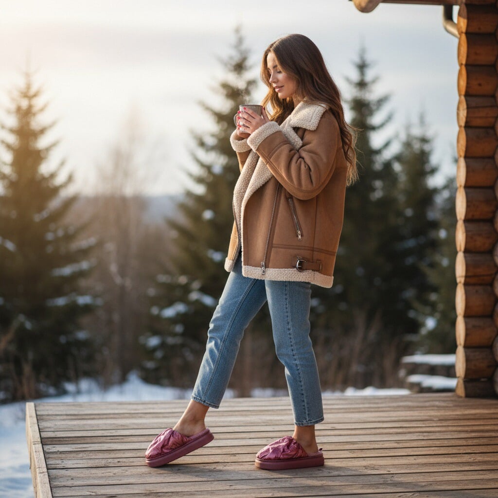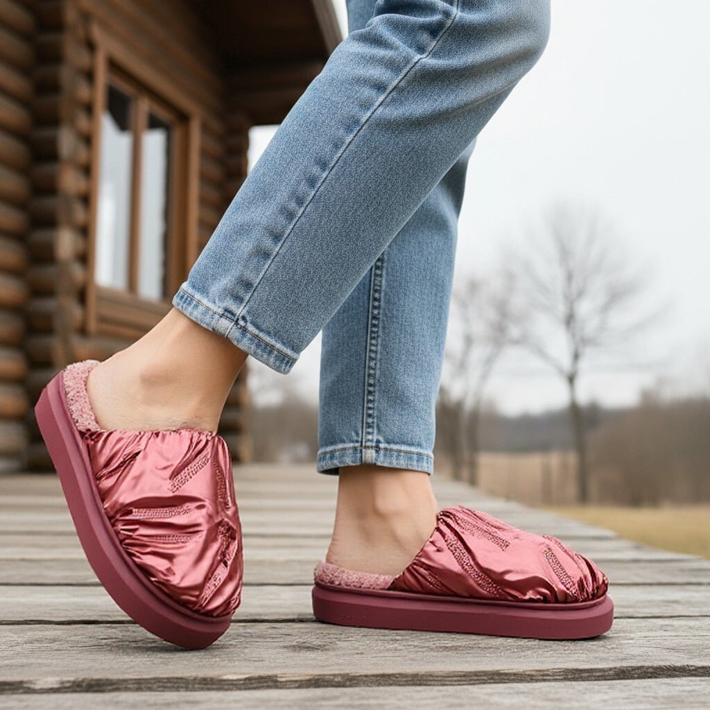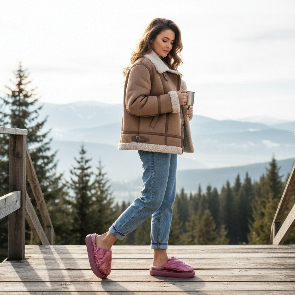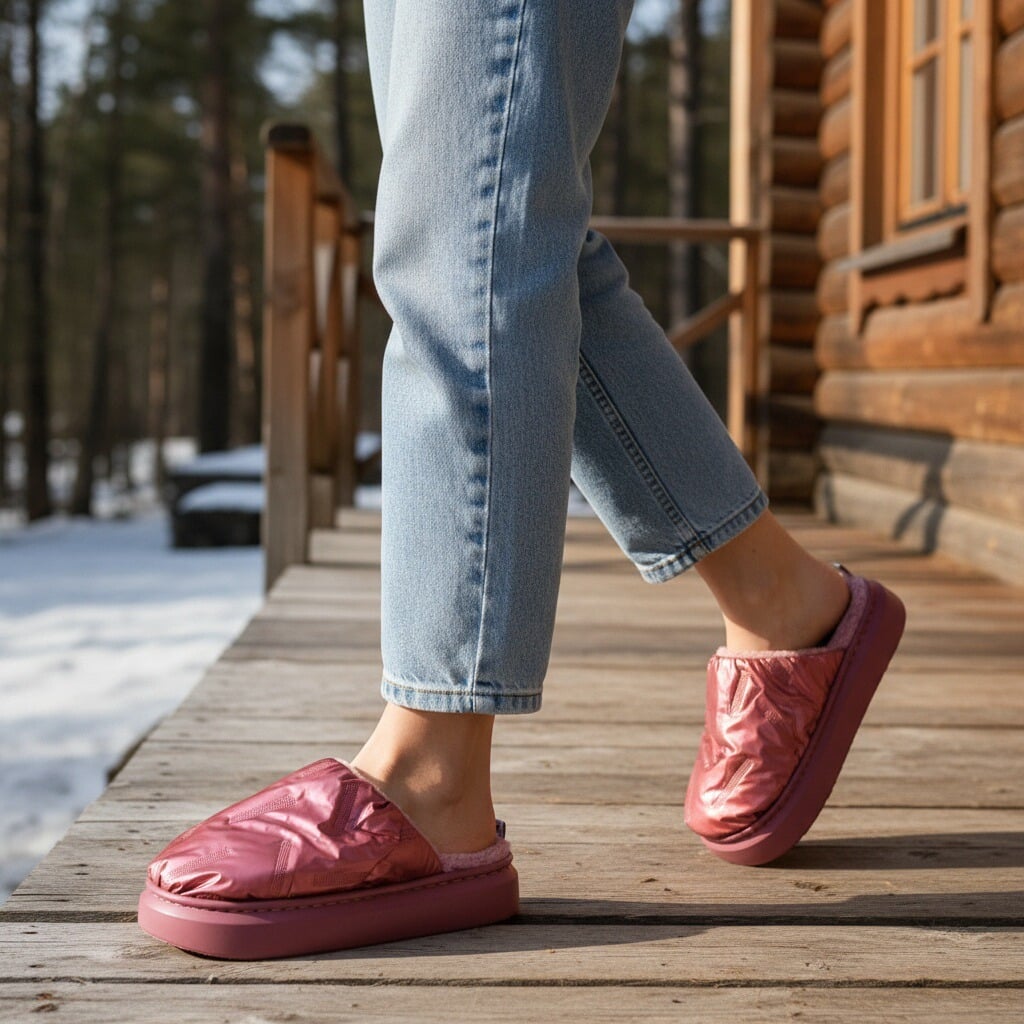 Papuci de casă pufoși și relaxanți, lucrați din materiale moi și călduroase. Sunt alegerea perfectă pentru confort și încălzire.