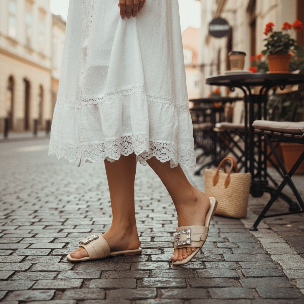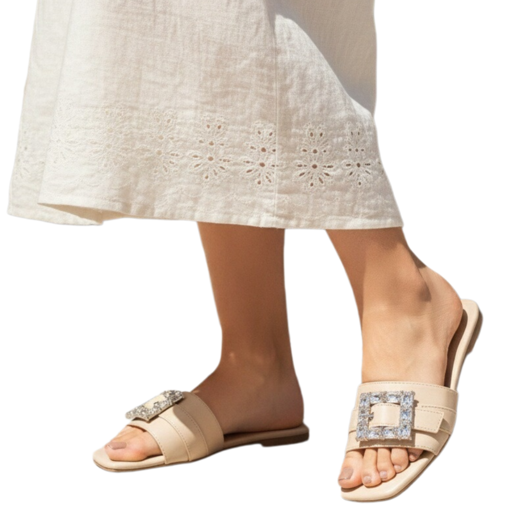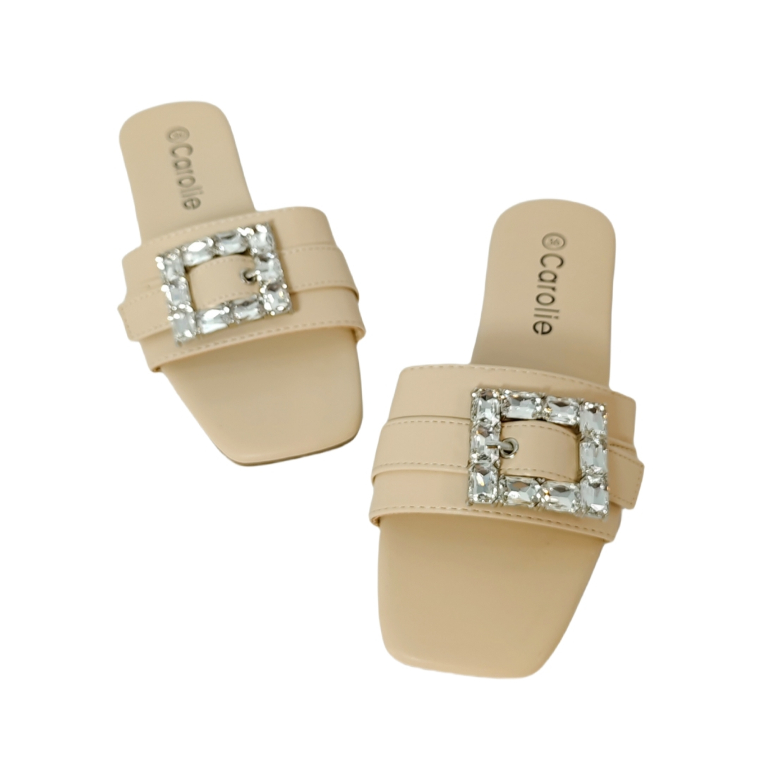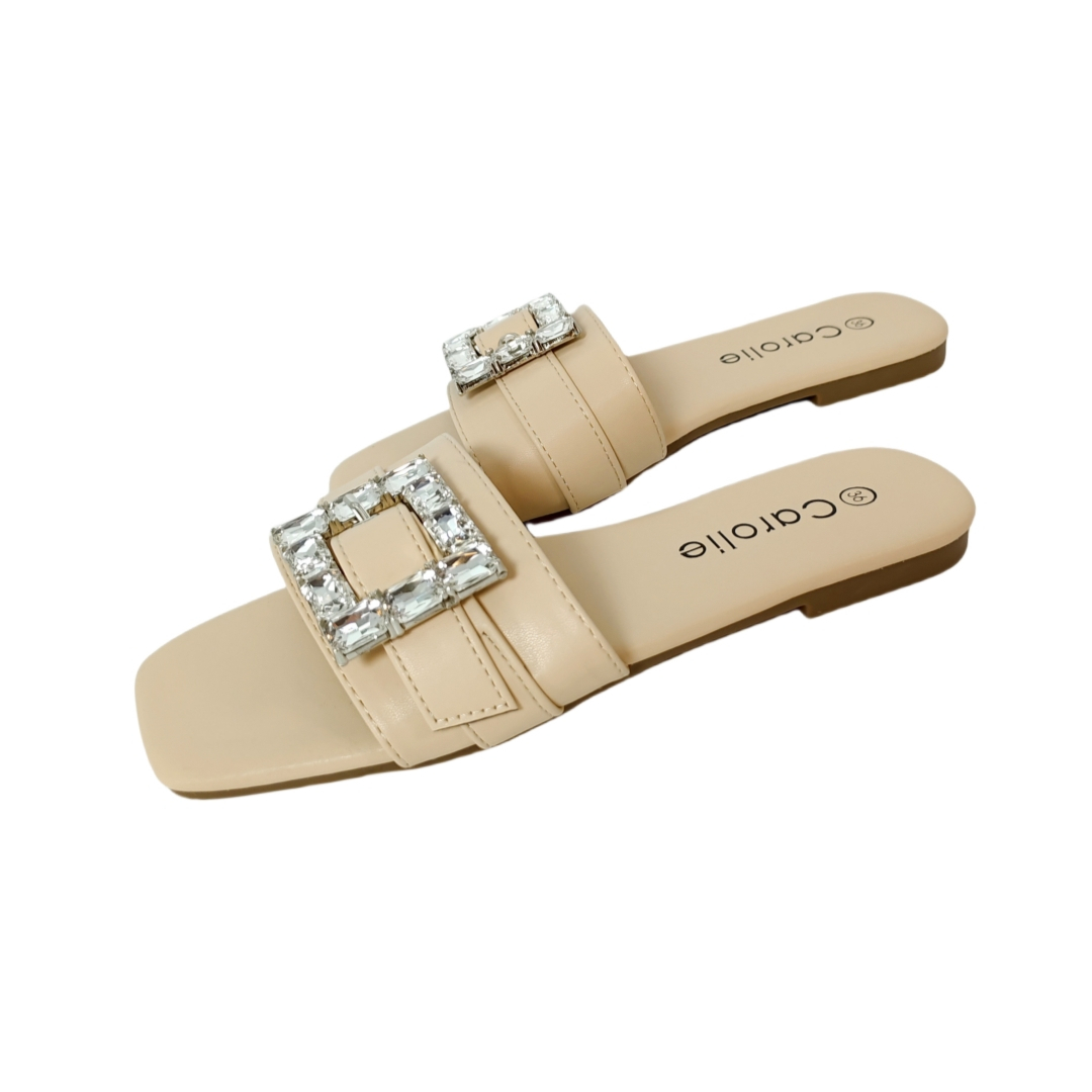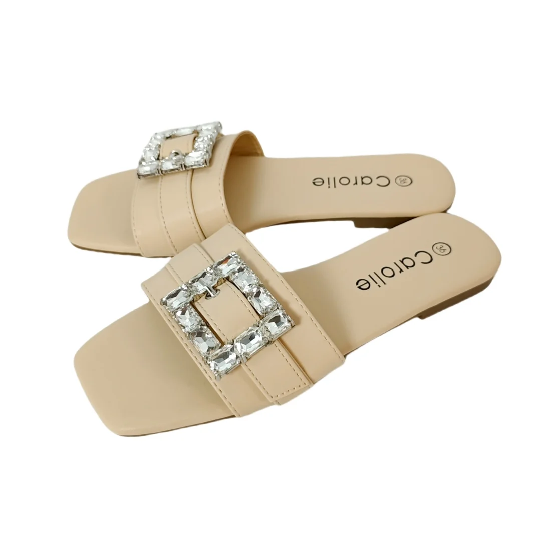 Papucii au un design elegant cu aplicatii cristale, ideali pentru a imbunatati orice tinuta, fie ea casual sau eleganta, ceea ce-i face o alegere versatila pentru diverse ocazii.