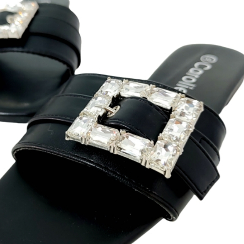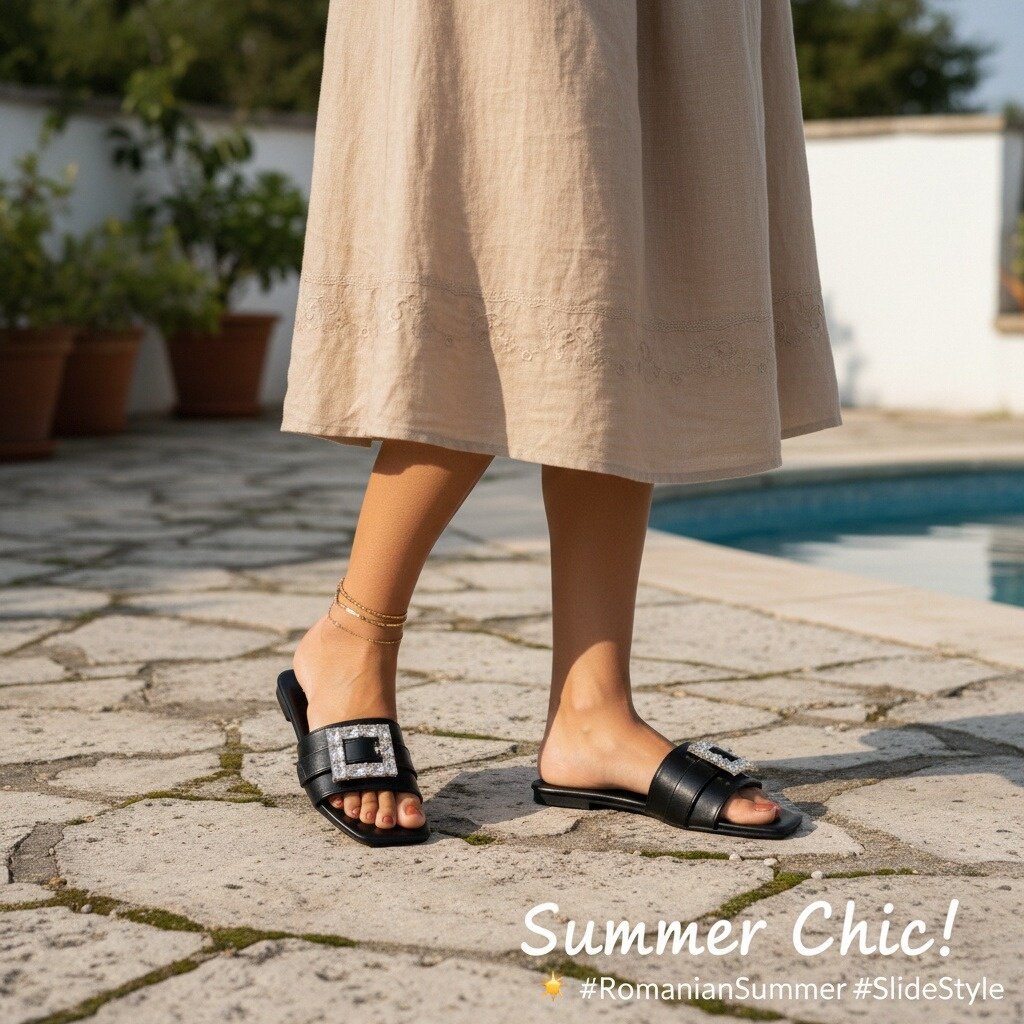 Papucii au un design elegant cu aplicatii cristale, ideali pentru a imbunatati orice tinuta, fie ea casual sau eleganta, ceea ce-i face o alegere versatila pentru diverse ocazii.