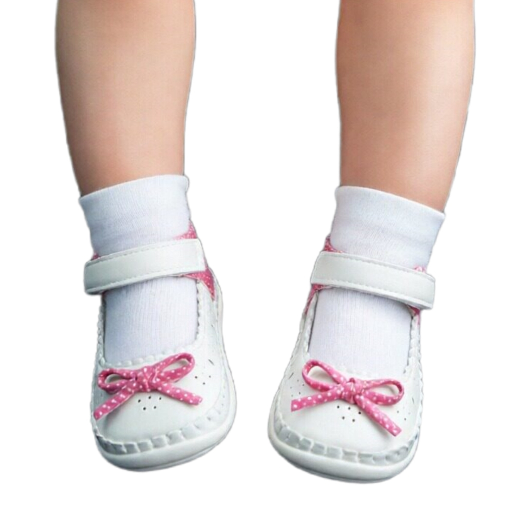 Confecționați integral din piele ecologică premium, branț ortopedic din piele naturală, talpă joasă și plată, vârf rotund, înălțime sub gleznă, sistem de închidere velcro și detaliu cu fundă decorativă.
